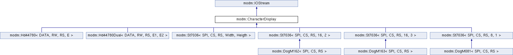 In contrast to other drivers which use static methods, this class is directly derived from modm::IODevice with all the virtual methods because it will be most likely used to create a IOStream which then handles the output to the display.