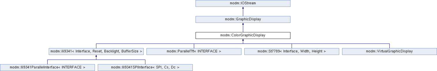 Implemented in modm::ili9341< Interface, Reset, Backlight, BufferSize >, modm::MonochromeGraphicDisplay< Width, Height, BufferWidth, BufferHeight >, modm::MonochromeGraphicDisplay< Width, Height, Width/8, Height >, modm::MonochromeGraphicDisplay< Width, Height, Width, Height/8 >, modm::ParallelTft< INTERFACE >, and modm::VirtualGraphicDisplay.